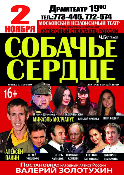 Спектакль, созданный по мотивам повести М.Булгакова «Собачье сердце» и оживший в новой постановке известного московского актера и режиссера Валерия Золотухина, поражает своей актуальностью и в сегодняшнее время. Загадочная Булгаковская мистика, современное видение сюжета гармонично вписались в концепцию спектакля.