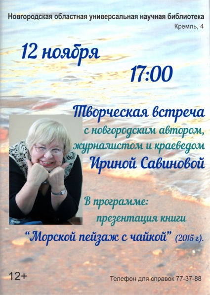 Ирина Дмитриевна Савинова известна как журналист и исследователь новгородской истории, поэт и участник первых походов по местам боёв под Мясным Бором. В программе встречи пройдёт презентация нового сборника автора - «Морской пейзаж с чайкой», изданном в 2015 году, в который вошли поэтические произведения, пьесы, киносценарии, воспоминания, публицистика. На встрече будет представлена выставка книг И. Д. Савиновой — сборников стихотворений, исторических краеведческих исследований: «Лихолетье. Новгородская епархия в годы советской власти. 1917-1991» (1998), путеводитель «Прогулки по Великому Новгороду (2009), «Польская речь на Новгородской земле» (2012), «Новгородцы в Отечественной войне 1812 года» (2012), публикаций в журналах «Чело», «Север» и других.
