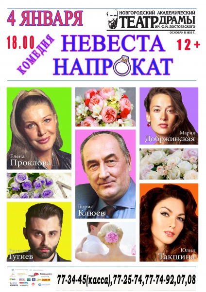 Легкая и светлая, пронизанная тонким юмором и иронией, комедия "Невеста напрокат" впечатляет с первых минут и оставляет после себя массу ярких воспоминаний. Да и как иначе, если в постановке задействованы такие звезды театра и кино, как Борис Клюев, Елена Проклова, Юлия Такшина и др.