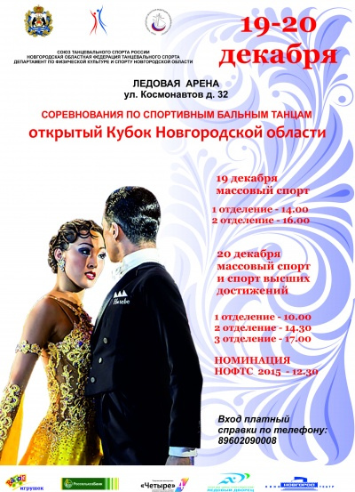 В зале хореографии Ледовой арены состоится Открытый Кубок Новгородской области по танцевальному спорту. В соревнованиях примут участие более 400 спортсменов различного уровня мастерства из Новгородской, Псковской, Тверской, Московской областей, Санкт-Петербурга и других регионов России. Всего разыгрываются награды в 25 категориях. В рамках соревнований пройдет церемония награждения Номинантов Новгородской областной федерации танцевального спорта по итогам 2015 года.