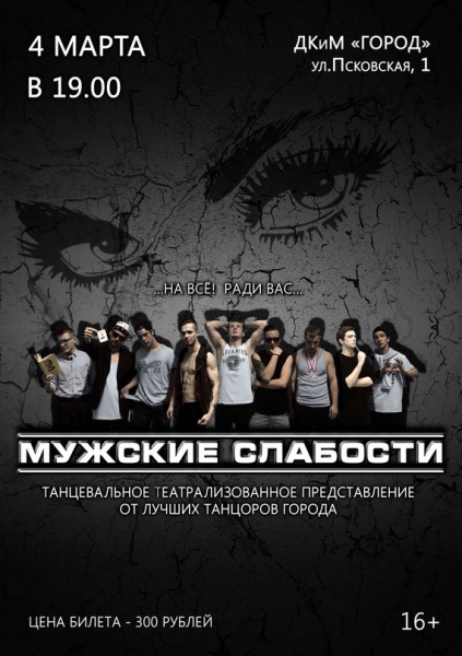 МУЖСКИЕ СЛАБОСТИ - мощнейшее танцевальное театрализованное шоу, с интересными историями, крутыми и качественными танцами, зрелищными трюками, неожиданными поворотами событий и бешеным разнообразием танцевальных направлений!