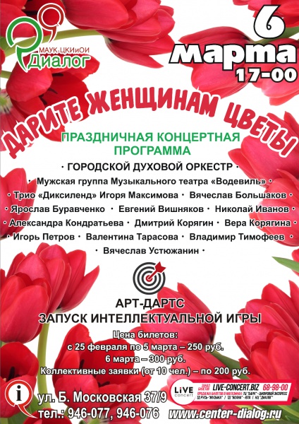 Накануне Международного женского дня Культурный центр «Диалог» приглашает новгородцев на праздничную концертную программу «Дарите женщинам цветы!». Основу концерта составят номера в исполнении Городского духового оркестра и его солистов: Вячеслава Большакова, Игоря Петрова, Дмитрия Корягина, Валентины Тарасовой, Владимира Тимофеева, Александры Кондратьевой.