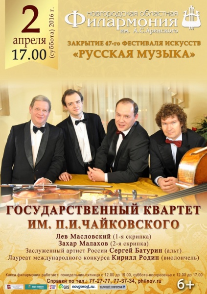 В рамках закрытия 47-го фестиваля искусств "РУССКАЯ МУЗЫКА" на сцене Филармонии выступит Государственный квартет имени П.И. Чайковского.