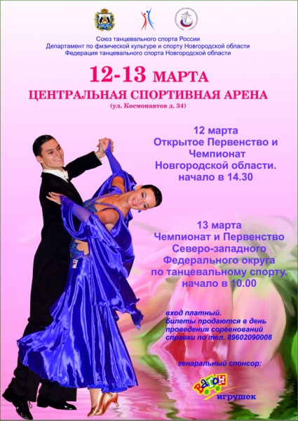 12-13 марта в Великом Новгороде состоятся соревнования по спортивным танцам: Открытые Первенство и Чемпионат Новгородской области и Чемпионат и Первенства СЗФО. Соревнования пройдут в здании Центральной спортивной Арены.