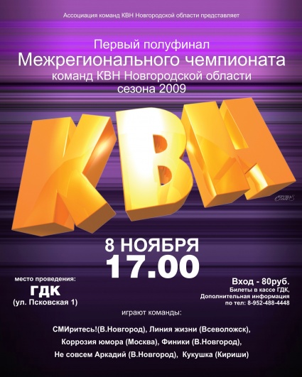 Ассоциация команд КВН Новгородской области приглашает вас на первую 1/2 финала Межрегионального чемпионата команд КВН Новгородcкой области, которая пройдет 8 ноября 2009 года в уютном зале ГДК \"Профсоюзов\" (Псковская 1)
