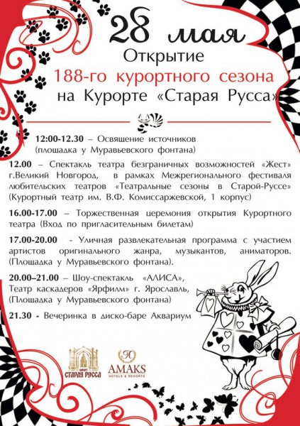 - 12:00 - Спектакль театра безграничных возможностей «Жест» г. Великий Новгород, в рамках Межрегионального фестиваля любительских театров «Театральные сезоны Старой Руссе» (Курортный театр им. В.Ф. Комиссаржевской, 1 корпус);