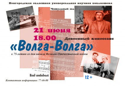 21 июня в читальном зале Новгородской областной универсальной научной библиотеки пройдет вечер с кинопоказом фильма «Волга-Волга», посвященный 75-й годовщине начала Великой Отечественной войны, и открытие книжно-иллюстративной выставки «В сорок первом, сорок-горестном году».