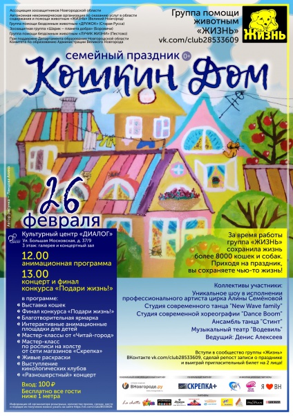 Новгородцев с детьми всех возрастов с полудня ждёт обширная анимационная программа на площадке галереи третьего этажа. Будет работать выставка кошек, подопечных группы помощи животным «Жизнь». Понравившегося кота можно будет забрать домой, но при одном условии: хозяева должны быть самыми любящими и ответственными.