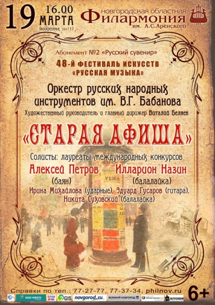 Программа «Старая афиша» - это новый виток, попытка сделать краткий экскурс по истории развития коллектива, его творческого становления. Концертная программа будет интересна не только ценителям и знатокам музыкального искусства, но и всем, кто любит красоту и искренность звучания русских народных инструментов.