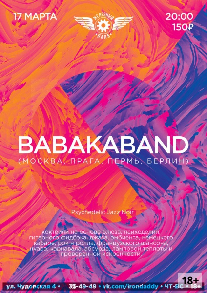Психоделическо-нуаровый бродячий театр Babakaband (Москва, Прага, Пермь, Берлин) покинет свою подмосковную резиденцию и отвлечется от записи альбома для того чтобы сыграть концерт в Железном Папе.