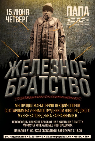 15 июня в Железном папе продолжится серия лекций-споров со старшим научным сотрудником Новгородского музея-заповедника Варнаевым В.Н.