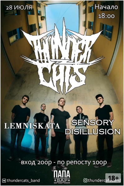 Вместе с THUNDERCATS выступят яркие представители тяжёлых андерграундных жанров Новгорода - эмоциональные LEMNISKATA и сокрушительные Sensory Disillusion.
