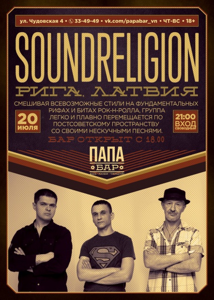 С апреля 2006 года рижская группа "SoundReligion", смешивая всевозможные стили на фундаментальных рифах и битах рок-н-ролла, легко и плавно перемещается по постсоветскому пространству со своими нескучными песнями.