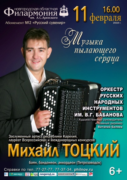 Концерт оркестра русских народных инструментом им. В.Г. Бабанова и заслуженного артиста республики Карелия, лауреата Всероссийских и Международных конкурсов Михаила Тоцкого — баян, бандонеон, аккардеон (Петрозаводск).