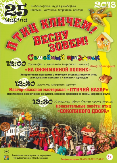 В программе: уличные игры со скоморохами, сказительницей Усладой Васильевной и гусельником Антонием, мастерская «Птичий базар» и выступление хищных птиц на Соколином дворе.