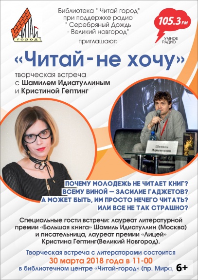 Почему молодежь не читает книг? На эту смогут поговорить все желающие с писателем, лауреатом литературной премии «Большая книга» Шамилем Идиатуллиным (Москва) и писательницей, лауреатом премии «Лицей» Кристиной Гептинг(Великий Новгород).