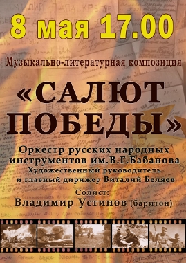О тематике предстоящего концерта Оркестра русских народных инструментов им. В.Г.Бабанова говорит само его название - "Салют Победы!". В эти майские дни мы славим людей, которые 65 лет назад защищали Родину от жестокого врага.
