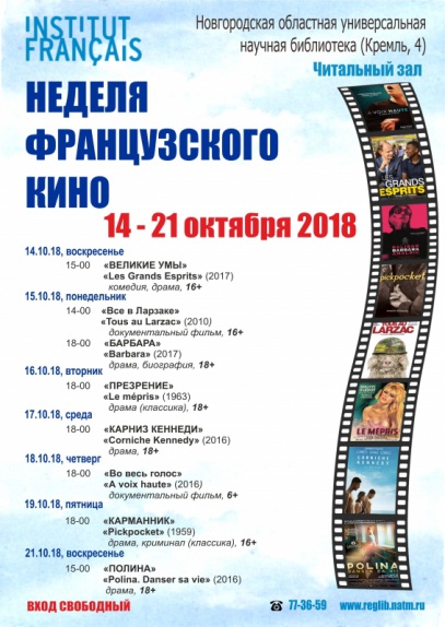 Новгородская областная научная библиотека совместно с Французским институтом в России организует Неделю французского кино. Будут показаны восемь художественных и документальных фильмов в жанре драма, комедия, биография, а также киноклассика