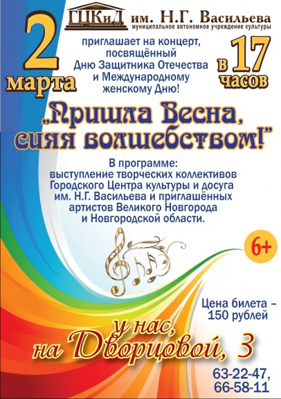В программе выступления коллективов Центра культуры и досуга им. Н.Г. Васильева, а также приглашенных артистов и творческих коллективов Великого Новгорода.