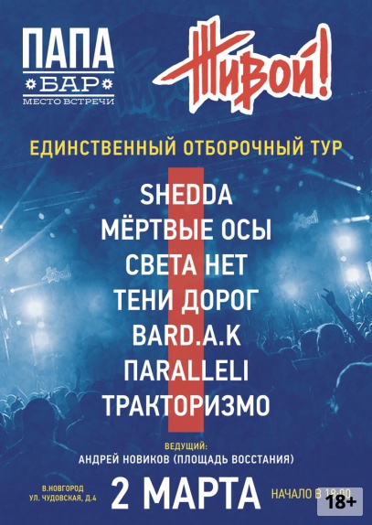 На сцене в этот вечер встретятся: SHEDDA, Мёртвые Осы, Света НЕТ, Тени Дорог, bard.a.k, IIаrаIIeli, Тракторизмо.
