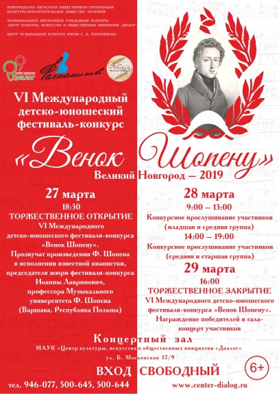 18:30 – 20:30 Торжественное открытие VI Международного детско-юношеского фестиваля-конкурса «Венок Шопену»;