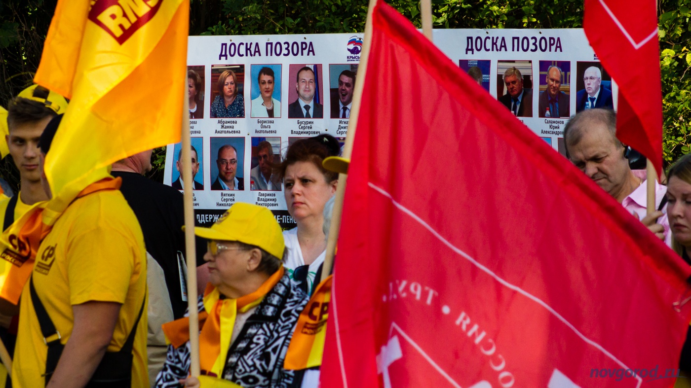 На протяжении всего митинга участники могли посмотреть на две «доски позора», где были размещены фото депутатов, поддержавших пенсионную реформу и повышение тарифов на услуги ЖКХ в Великом Новгороде.