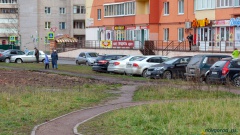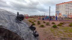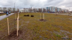 На заднем фоне видно ели, которые посадили жители. По информации отдела-центра при мэрии города, их должно было быть около 30, общественники заявили 10, из них сейчас осталась только половина.