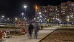 Хорошее освещение, чистые широкие дорожки — залог того, что сквер будет пользоваться популярностью у жителей микрорайона. Днём здесь гуляют дети, вечером — любители спорта.