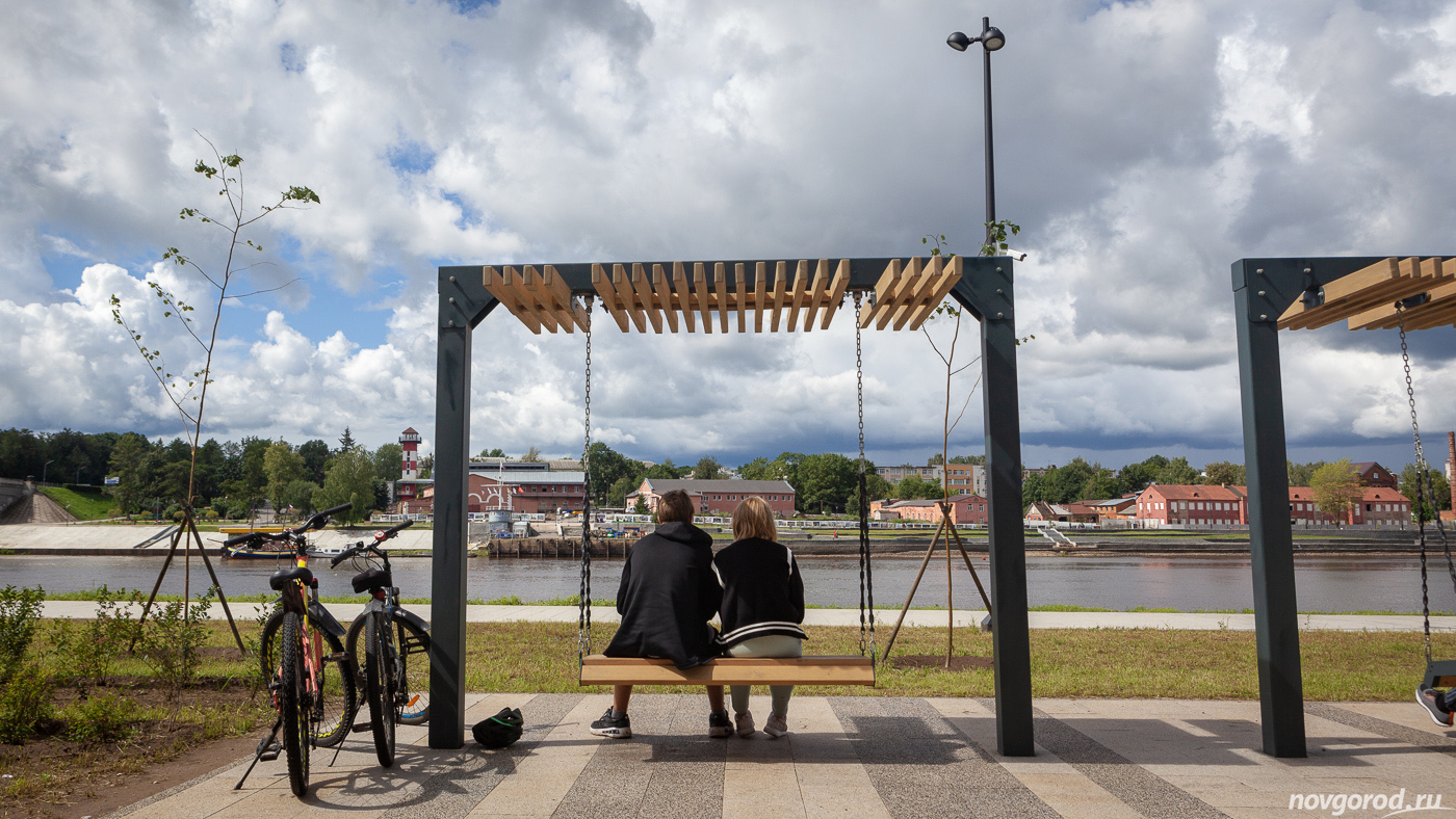 Новгородцы оценили новые качели. Многие фотографировались, а кто-то просто наслаждался видом или присел отдохнуть.