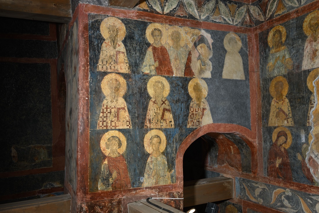 Сохранившийся уникальный ансамбль росписей ХV века — необычный для Руси пример иллюстрации церковного календаря, где в интерьере представлены поясные изображения святых по дням празднования их памяти. «Чтение» росписи начинается с сентября и разворачивается по часовой стрелке на стенах и столбах храма. Около 430 фигур, изображающих святых, соответствуют дням и месяцам года. Здесь каждый посетитель может обратиться с молитвой к своему святому и насладиться общим видом великолепной росписи.